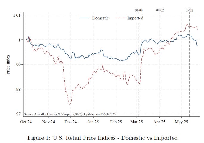 US Customs does not enforce properly? The average tariff rate on imports in May was ~6%, below the official blended rate of ~16%. This may be due to lack of enforcement (intentional or not) or importers evading duties by other means, such as transshipment through low-tariff countries.