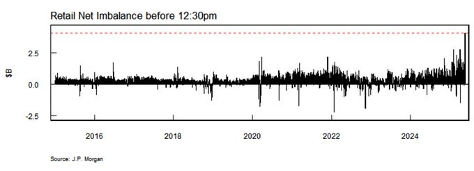 During yesterday's trading session, US retail investors placed a record number of orders as stocks dipped slightly due to Moody's downgrade of US debt. This follows a multi-week buying streak amid the market sell-off caused by tariffs. Meanwhile, institutional investors largely sold, only to be forced to buy back more recently.