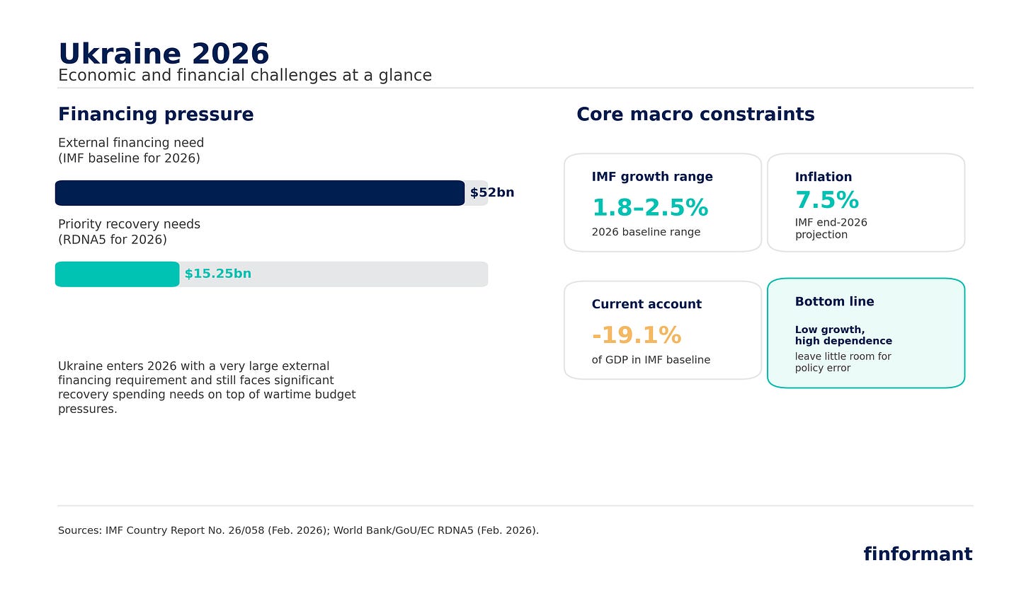 The immediate trigger is fiscal. On March 18, an IMF mission began talks with Ukraine as Kyiv struggled to pass unpopular tax measures tied to a new $8.1 billion program. Ukraine will require between $45 billion and $52 billion in external financing this year to cover its budget deficit. In a war economy where domestic revenue is largely consumed by defense, this is not a secondary issue. It is the state’s operating margin.